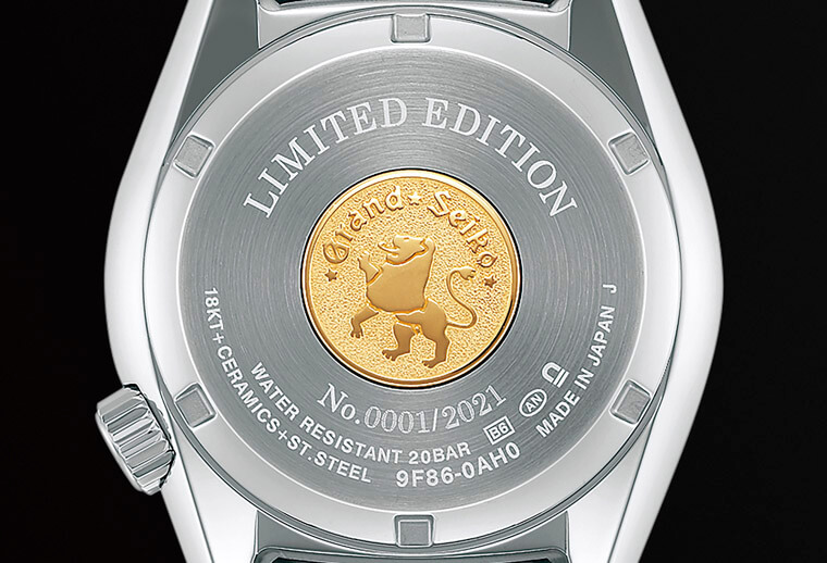 SBGN023錶圈上擁有24小時可度可以與金色的GMT指針搭配作為兩地時間顯示,此外品牌在錶圈內側也貼心地採用黑色與金色的設計,賦予24小時刻度更直覺的日夜分隔效果,而面盤上也還有大三針與日期顯示提供實用的顯時資訊。手錶底蓋中央鑲有代表GS的18K金獅子標誌,同時圖案上方明確刻上”LIMITED EDITION”字樣,另外在圖案下方也還一一刻上每只錶的限量編號(全球限量2021只),由此烘托手錶具備的週年紀念特別意義。