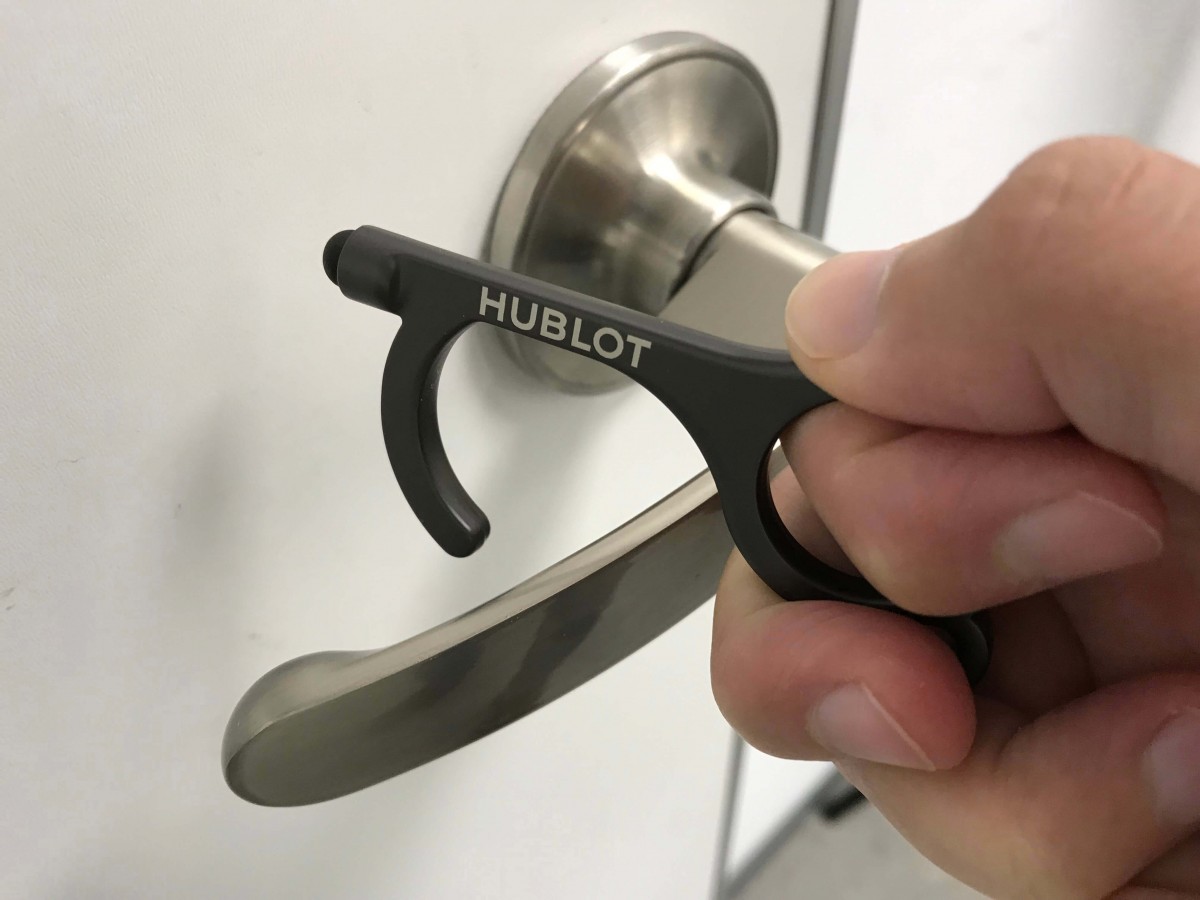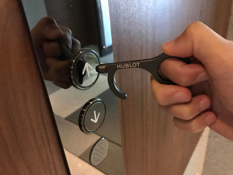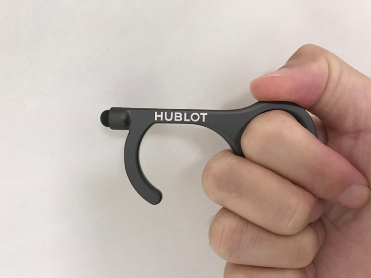 如圖所見,宇舶防疫神器其實是一個黑色的金屬,乍看有點像是開瓶器之類的,但再看了看這件工具後小編恍然大悟了。現在疫情嚴峻,大家出門在外都希望盡量減少觸碰到比較多人會接觸到的地方,例如門把、電梯按鈕等等,所以之前在網路上就看過有人會用鑰匙、筆等等的替代工具取代手來按電梯,宇舶這個防疫神器便擁有類似的功能,可以避免手部直接接觸到按鈕,而且仔細看筆尖的地方材質並非是金屬,所以如果要用它來操控例如提款機的觸控螢幕應該也可以。