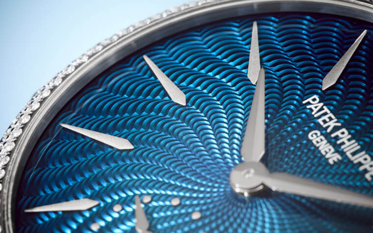 這款是PP嶄新創作的報時女錶,錶款以白金材質打造36mm的中型錶殼,錶圈分成兩排共鑲嵌多達168顆美鑽,百達翡麗採用火光鑲嵌工藝將鑽石安穩且盡展光芒地固定在錶圈上,同時它的線形錶耳則帶有一點復古氛圍。手錶的面盤飾有手工雕飾螺旋紋圖案,並塗覆藍色透明琺瑯,借助Flinqué透明琺瑯珍稀工藝,讓機刻花紋多了色彩的魔力,此外包括指針與時標同樣採用劍形設計,至於6點方向的小秒針外緣則鑲上12顆金質圓點作為秒數代表刻度,整體看起來細緻俐落,但翻到錶背又能見到報時機制這種高端複雜的工藝手錶,展現突破傳統女錶功能趨於基本的刻板印象。