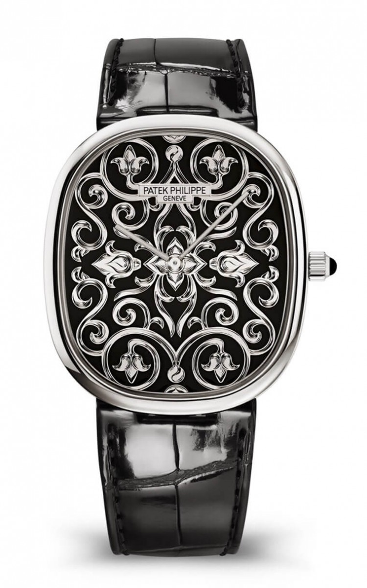 18K白金材質/240自動上鍊機芯/時、分顯示/黑色琺瑯手工雕刻面盤/藍寶石水晶鏡面/錶徑39.5x34.5mm