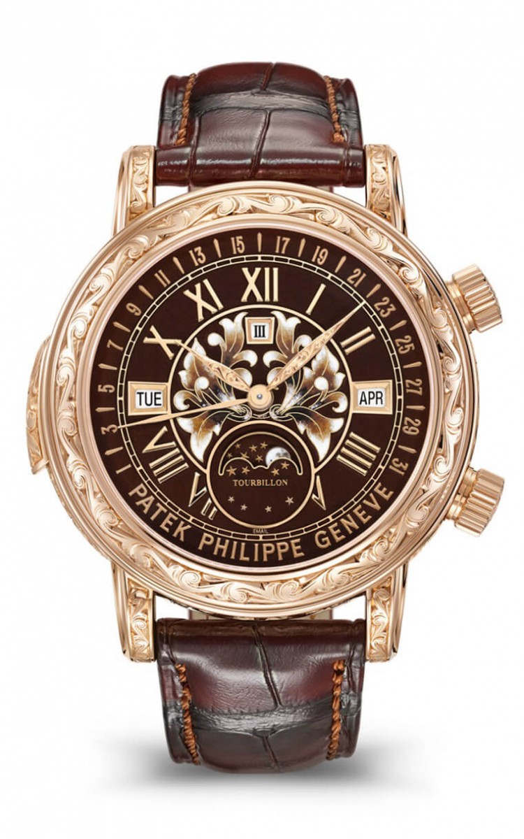 這款收藏家夢寐以求的天文陀飛輪雙面錶共結合了12項複雜功能,包括採用雙音簧的教堂鐘聲三問功能、陀飛輪、萬年曆、恆星時間與北半球天體與月相顯示等等,新款換成了玫瑰金錶殼,搭配棕色的大明火琺瑯面盤,品牌工匠以一塊K金原料精雕細琢,以藤蔓花紋為靈感加以延伸至錶殼外貌,藉由銳利的雕刻刀與鑿刀賦予錶圈、錶殼、錶冠、三問報時滑桿與錶耳繁複細膩的立體裝飾圖案,無論造型或是功能都匯聚百達翡麗的尖端水準。
