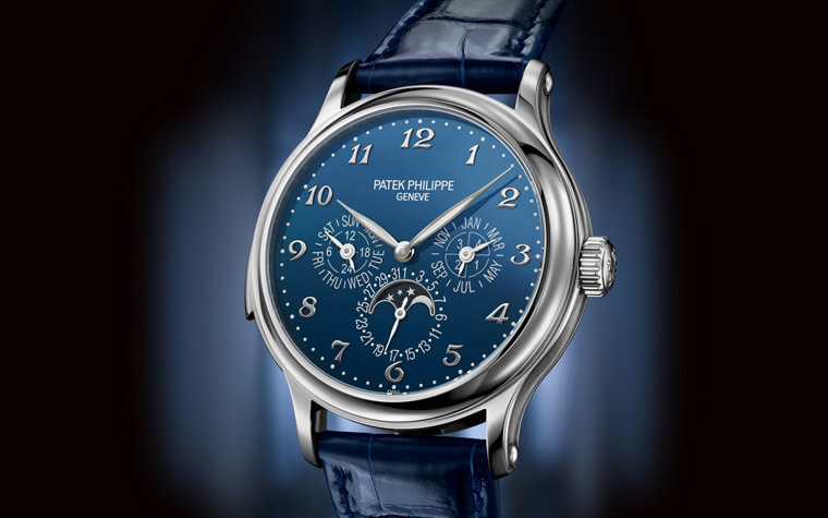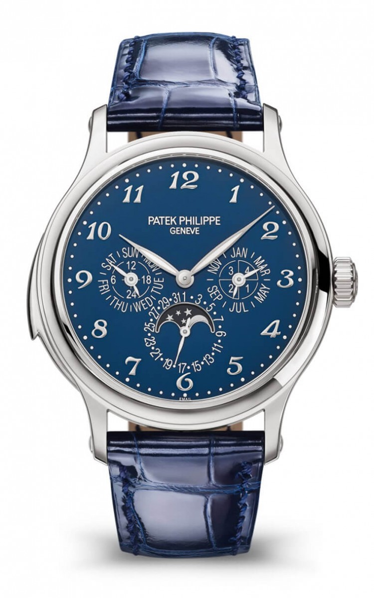 5374換上白金錶殼搭配藍色大明火新亮相,這款錶身兼三問和萬年曆兩大頂級功能,有別於品牌先前推出的款式為鉑金錶殼搭配黑色琺瑯面盤,新款5374G整體的視覺印象呈現出另一種新風格。錶款的面盤格局走的是比較傳統的路線,包括以小錶盤顯示日、星、月和閏年等與萬年曆相關的功能,另外月相顯示則是與指針式日期錶盤同軸至於面盤6點方向。錶背露出R 27 Q自動機芯的樣貌,這枚機芯同樣也是採取微型自動盤設計,因此機芯結構雖然複雜,但機芯厚度也才6.9mm,突顯PP注重佩戴舒適性的用心。