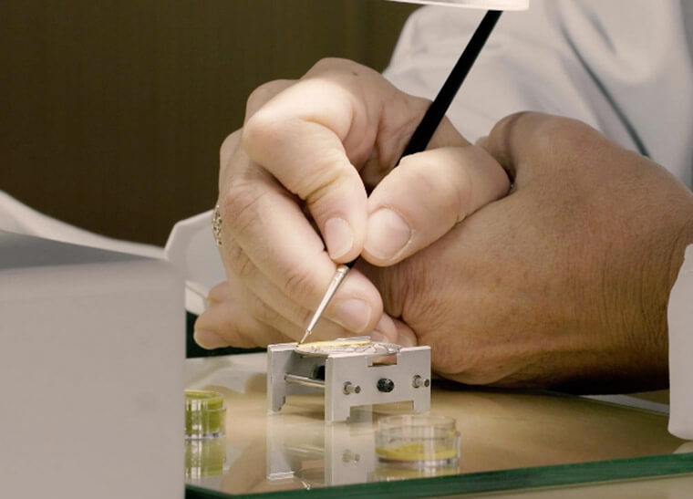 寶石鑲嵌工藝:將寶石或鑽石一一鑲嵌在時計作品上,藉由寶石迷人的光澤和色澤,賦予時計作品閃亮耀眼的裝飾效果。