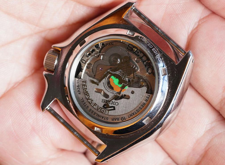三款錶的透明底蓋上印有ROWING BLAZERS代表性的沉思骷髏圖案,底下露出SEIKO的基礎機械機芯4R36機芯,這枚機芯能顯示時、分、秒與日期和星期,震頻21,600轉,動力儲存則也屬於入門規格為41小時。