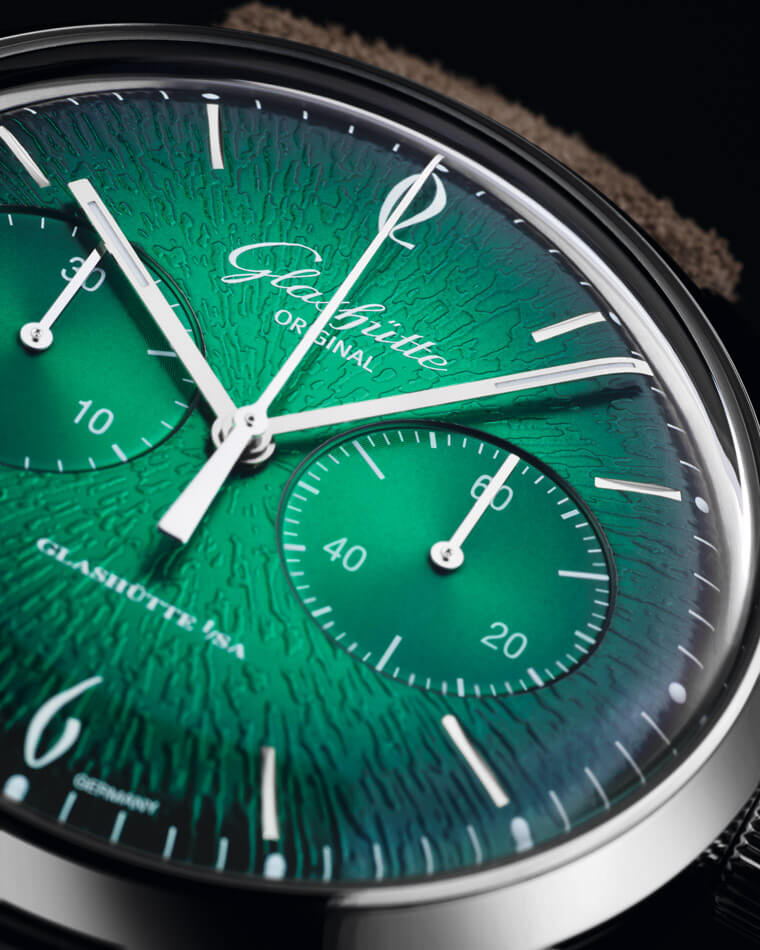 至於錶款最主要的亮點還是在於面盤顏色,品牌位於德國南部Pforzheim市的面盤廠這次精心調配出迷人的綠色調裝飾面盤——從面盤中央到邊緣,綠色調會從鮮亮逐漸開始加深至深綠色,藉由這種層次感十足的漸變色彩效果賦予單色調的面盤更吸睛的魅力。除了漸層綠色外,格拉蘇蒂原創還採用特殊壓花工藝處理,形成面盤上那種不規則的立體紋路,搭配手錶特色的12點和6點方向阿拉伯數字鑲貼時標以及修長的指針,造就Sixties計時碼錶年度限量版深刻的第一眼印象。