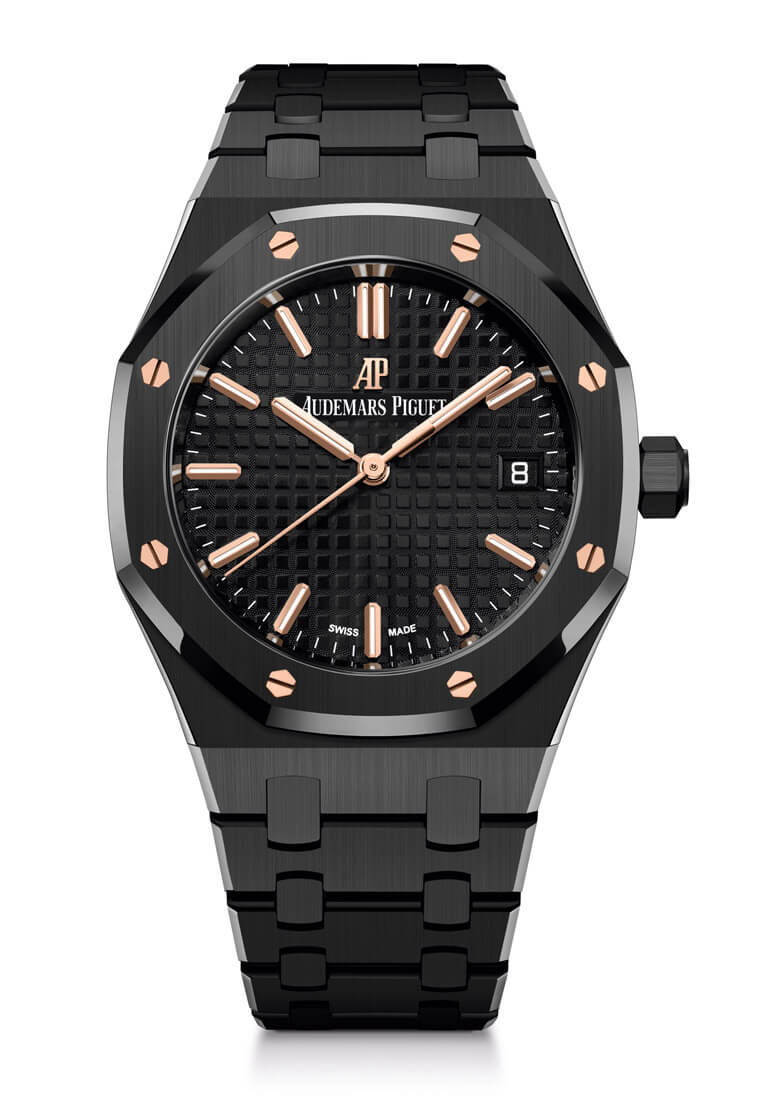 ▲包括錶圈固定螺絲、時標和指針都是玫瑰金材質製成,這種搭配過去在皇家橡樹的黑陶瓷款式中尚未出現過,散發出一種低調奢華的時尚感。