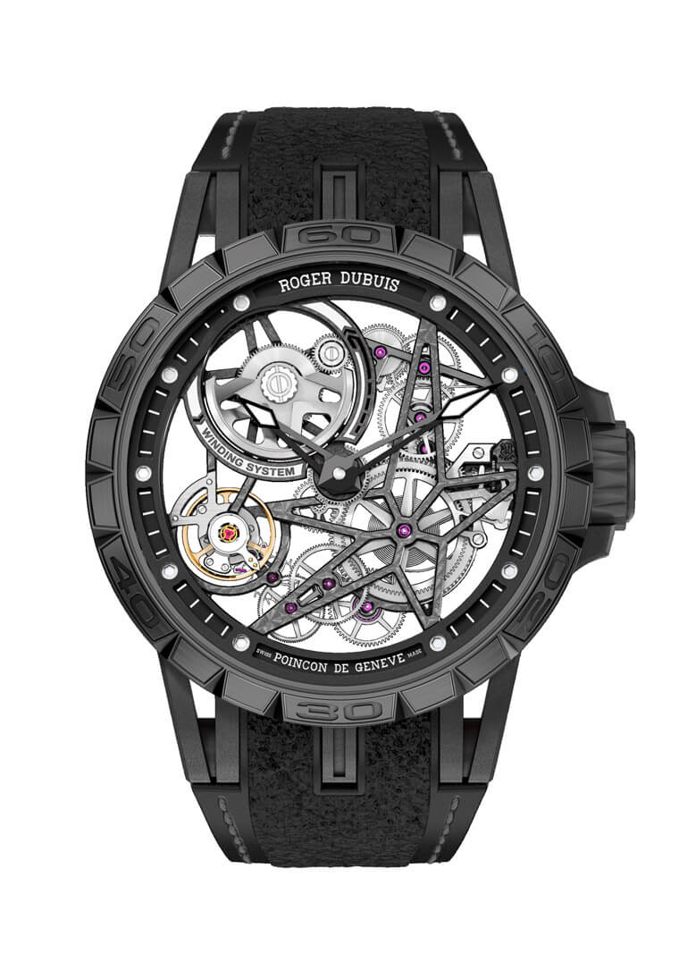 除了充滿話題性的快拆系統以及替換套件,手錶本身則是搭載羅杰杜彼研發的RD820SQ自動機芯,這枚機芯展現出品牌擅長的鏤空工藝,甚至還將微型自動盤前置於面盤側,讓它和面盤右下角的星形鏤空橋板上下呼應,此外機芯的擒縱系統也是反轉置於面盤側,這下讓自動盤、擒縱系統等通常都只有在錶背才會看得到的組件都能在手錶正面一覽無遺,展現出羅杰杜彼藝高人膽大的工藝水準,從機芯零件上刻印的日內瓦印記可知它的外表作工以及走時品質都達到一流標準。