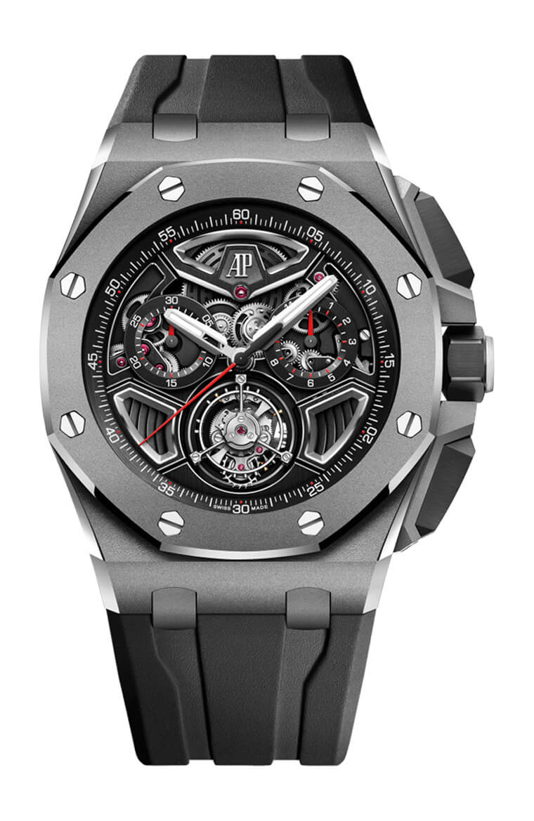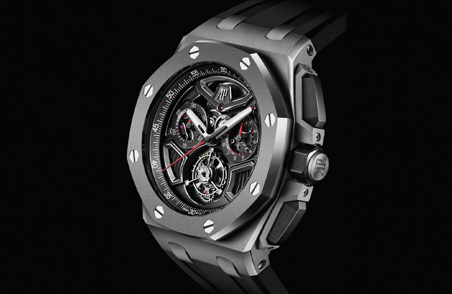 ▲愛彼的皇家橡樹離岸型系列新增自動上鍊的陀飛輪計時碼錶,手錶錶徑下修至43mm,成為目前系列的陀飛輪作品中尺寸最小的一款。