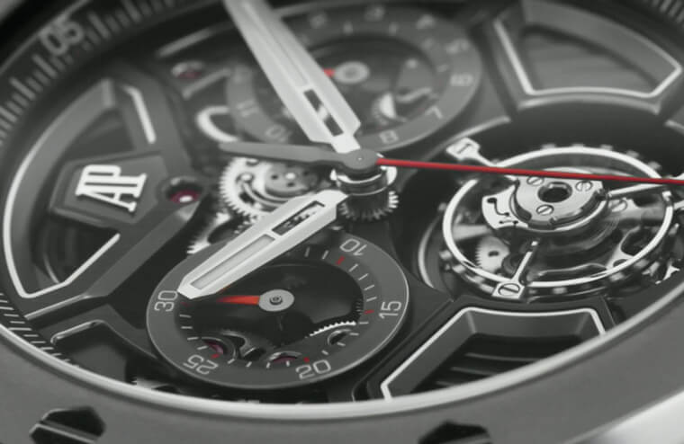 26622TI在面盤格局上和26348IO乍看都是屬於雙眼形式,不過後者的3點和9點方向分別是計分盤與小秒盤,26622TI的3點和9點方向反而是計時盤與計分盤,由於陀飛輪每秒自轉一週其實也帶有小秒的功效,因此愛彼在此挪出空間來放置計時盤,對於測量更長久的時間更有幫助。新款的面盤還有幾點細節調整值得注意,例如它的兩枚小錶盤和時、分指針接近中央軸心的位置都進行鏤空處理,讓佩戴者可以藉此感受手錶機芯的立體複雜結構;再來就是中央的計時大秒針除了末梢平衡器是黑色外,整枚指針都塗上了紅色以突顯它的存在感,這跟26348IO僅在秒針針尖塗紅的方式也有點不同。