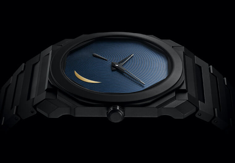 寶格麗第二度與日本大建築師安藤忠雄合作開發聯名錶。手錶外部以黑色陶瓷材質製成,而它所採用得透明錶底蓋剛好可以呼應安藤忠雄所鍾愛的建築通透感。這款錶以象徵時間奧義的黑洞為靈感,設計出宛如永恆延伸的螺旋鐫刻面盤。雙方沿用安藤忠雄所鍾愛的「時間」主題,再揉合三日月(Mikazuki)元素,日文中的三日月指的是初露月牙的新月,在新月期間,月亮被地球的影子覆蓋,所以從地上望去只能見到一彎月牙。面盤上的時光漩渦從小秒針盤的中心向外擴散;金色月牙則掛在5點鐘位置的夜空,它並非月相顯示,但是蘊含的點綴效果卻頗為強烈,整只錶融合月亮與螺旋兩個意義深遠的元素,將安藤忠雄對於時間的詮釋體現在外觀造型的巧思中。