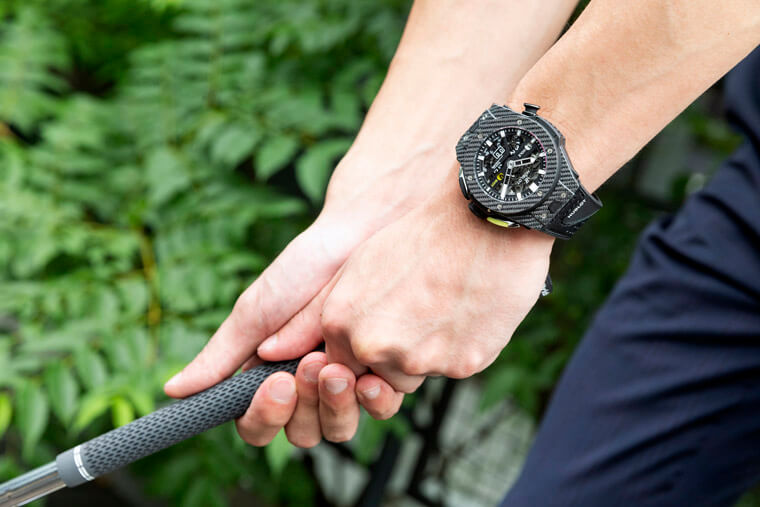 Big Bang Unico Golf高爾夫手錶使用鍍鋁碳纖維(Texalium®)材質製作錶殼,這種材質平常很少聽說,因為它屬於宇舶獨家的研發成果,簡單來說品牌是把碳纖維與鋁金屬融合,這樣一來可以確保手錶擁有兩種材質的優點,至於提到鋁和碳纖維大家會想想到什麼特點?應該多數人會先想到「輕量」的部分,確實,ig Bang Unico Golf高爾夫手錶的錶徑雖達到45mm,但是它的整體重量只有98公克,輕到讓佩戴者在進行揮桿動作時也不會感到被束縛。