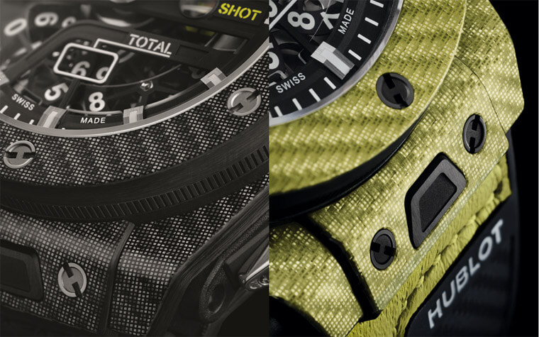 鍍鋁碳纖維和傳統碳纖維有點不一樣的部分是它的顏色並非只有單一的黑色系,例如宇舶除了推出黑色系的Big Bang Unico Golf高爾夫手錶,同時還有啟用黃色鍍鋁碳纖維材質的版本,不同顏色的錶殼搭配同色系的錶帶,使得手錶能呈現出獨特的個性,佩戴時也不會有那種看起來都差不多的感覺。