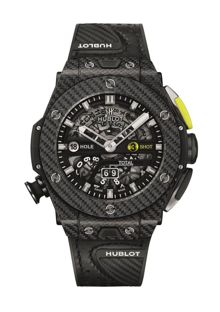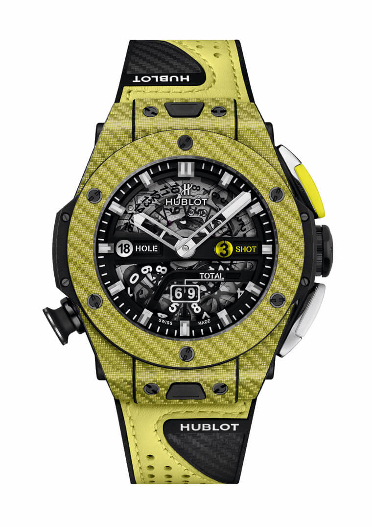 除了外觀之外,Big Bang Unico Golf高爾夫手錶之所以會受到高球愛好者青睞還有個重要關鍵就在於它的高爾夫球專業機能,例如佩戴者按下2點方向的按把便能啟動「揮桿數顯示」,藉此記錄揮桿次數並計算每一洞的桿數;另外按下4點方向的按把,則可以將桿數顯示歸零以便重新計算。而在面盤的6點方向有個看起來是大日期顯示的機制真正的作用在於顯示錶主的總桿數,一旦佩戴者按下8點方向的按把,那麼面盤顯示的比賽成績記錄就可以全部歸零重新計算,相當方便。