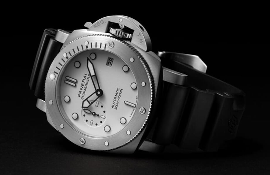 PANERAI沛納海的Submersible系列是品牌鑽研防水性能的代表,通常這系列手錶的防水能力都有300米(僅少部分貴金屬款式為100米),加上單向旋轉錶圈設計等元素,展現符合專業潛水錶規格的能耐。由於像是ISO 6425對於潛水錶的規範中有一條「面盤上需有清晰易辨的分鐘刻度」規定,所以一般而言潛水錶的面盤也都是以黑色為主,這點對照沛納海Submersible系列的手錶也通用,此系列中多數手錶的面盤都是黑色,偶爾有一些藍面、灰面或棕色面盤,但它們的視讀性拜品牌簡約俐落的面盤設計之賜也都還滿清楚的,然而品牌最近有一款42mm的Submersible潛水錶(PAM01223)有點不一樣,因為它有別於系列目前所有錶款,竟然是搭配白色面盤!這有點顛覆潛水錶定律的作法,使PAM01223成為沛納海旗下一款相當醒目的入門潛水錶。