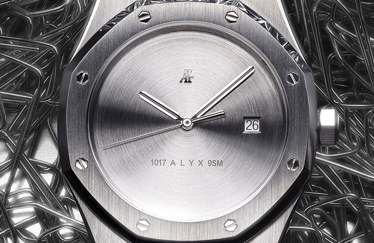 至於在去掉那麼多皇家橡樹系列本有的設計之後,MAD Paris做了什麼修改來突顯Matthew M. Williams的個性呢?首先他們在面盤施加比較樸素的同心圓打磨,而且面盤也沒有額外鍍上其他顏色,就保留金屬原本的色澤,另外在面盤6點方向刻上Matthew M. Williams自己的品牌名稱——”1017 A L Y X 9SM”,和我們想像得不太一樣,因為時尚品牌創意總監理想的皇家橡樹手錶反而是素到不能再素的外型。