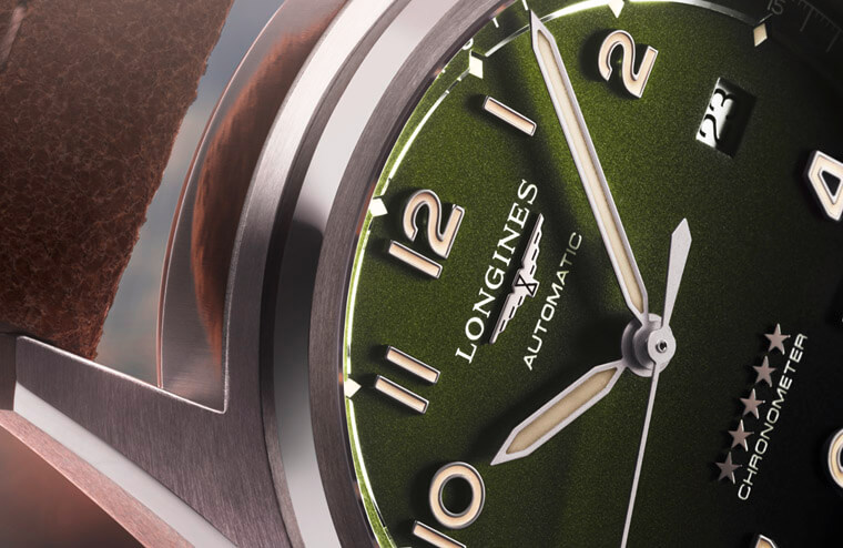 新款綠色面盤的先行者手錶為大三針加日期顯示功能,品牌分別推出40mm和42mm兩種尺寸,雖然大小微微有差異,但是它們的面盤格局和顏色都一致,在偏向卡其綠色的軍風綠面上,包括時標和指針都塗有米色的Super-LumiNova®夜光塗料,從中隱隱散發出復古況味。而綠色面盤還特別以噴砂處理,一方面與面盤外緣刻度環的拉絲處理區隔,也讓面盤的綠色看起來獨具立體感。
