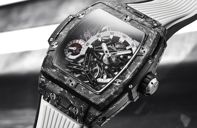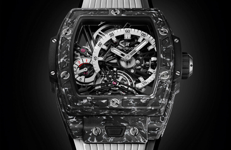 Spirit of Big Bang陀飛輪碳纖維五日鍊手錶以融入白色複合材質的碳纖維材質打造錶殼,因此它的不規則外觀色彩紋理比起傳統碳纖維更富有層次變化,且宇舶經過獨家製程做出的複合碳纖維,不只是外觀獨特、重量輕盈,它的韌性和抗斷強度也在加工過程中獲得提升。