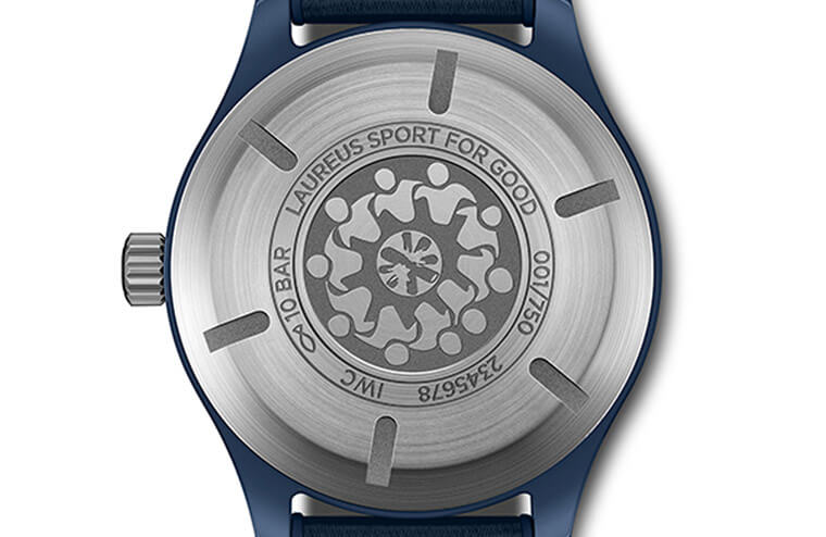 錶背的實底蓋(應為鈦金屬材質)上不免俗地刻有2021年IWC和勞倫斯體育公益基金會所舉辦繪畫比賽的得獎作品,今年獲獎者為一位來自哥倫比亞的12歲小朋友Melissa Mejía Castilla,他幫他的作品取名為“Vivir en Armonía”(西班牙文「安居樂業」之意),畫中可見由不同色彩、象徵來自全球各地的人們團結在一起圍成一個圈共享柴火傳遞的溫暖氣氛,同樣的圖騰背完整移植到手錶的底蓋上,上頭還刻有勞倫斯體育公益基金會名稱以及手錶限量編號等資訊,與手錶正面的藍色調異曲同工地展現呼應主題的關聯性。