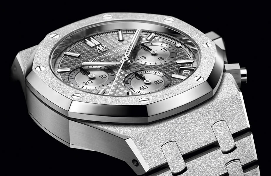 皇家橡樹霜金自動上鍊計時碼錶的面盤採用淺灰色色調,這也是皇家橡樹系列計時碼錶首度啟用的新色,和之前品牌出過的深灰色面盤有細微差異,並鐫刻"Grande Tapisserie"大型格紋裝飾圖案,搭配螢光塗層白金立體時標與指針。銠色調分鐘計時盤與小時計時盤的位置經過調整後更加順暢易讀。