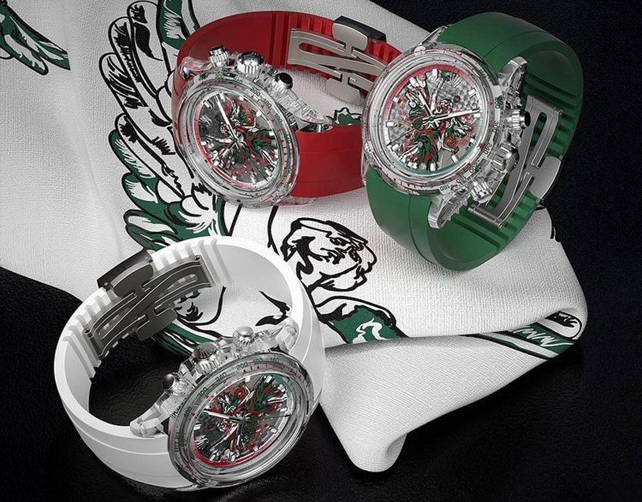 承前所述,這款透明殼Daytona受到西班牙文化的啟發,AET REMOULD從墨西哥城的著名地標獨立紀念柱(Independence Monument)以及墨西哥國旗汲取靈感,分別在面盤加上獨立紀念柱上的天使雕像彩繪,這尊雕像手持月桂冠葉並有一對翅膀,象徵墨西哥自由民主的精神,同時品牌也把墨西哥國旗的代表色例如綠、紅、白色等融入天使圖案以及錶圈刻度等處,包括錶帶也能選擇搭配三種顏色的橡膠錶帶。