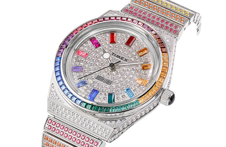 美國水晶配件品牌JUDITH LEIBER與平價手錶品牌TIMEX天美時合作打造相對高端的珠寶手錶,雙方以天美時的T80和Q TIMEX兩個系列為基礎,打造出兩款鑲滿水晶的華麗風格手錶,以TIMEX手錶通常幾千塊的價位而言,與JUDITH LEIBER聯名的寶石手錶價位一口氣跳漲約10倍,顯得頗為奢華;但如果你把這兩款TIMEX x JUDITH LEIBER的彩色寶石手錶與瑞士高級錶壇出產動輒百萬、千萬以上的彩虹圈手錶或珠寶錶相比,瞬間又會讓人驚豔原來我們離彩虹圈的距離可以這麼近!難怪手錶一推出便引起市場關注。
