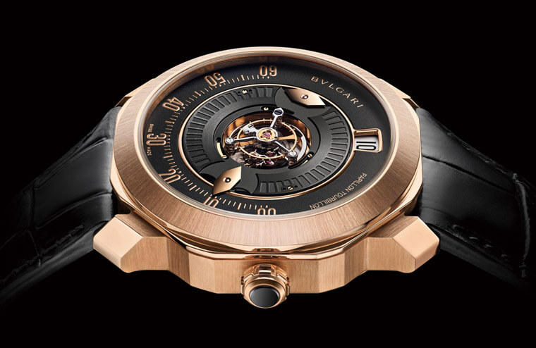 ▲由於Papillon系統需佔據面盤至少一半的空間,加上跳時窗又固定在12點方向,促使寶格麗將陀飛輪中置於面盤中心,展現出讓複雜功能順應特殊專利設計的製錶巧思。