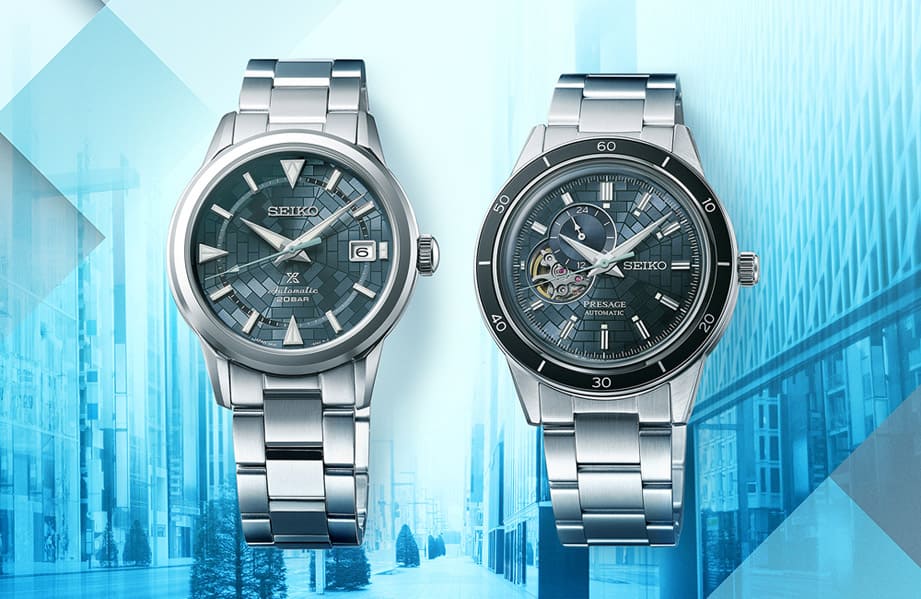 兩款銀座紀念款透過秒針色彩及面盤紋路,將銀座的城市魅力濃縮在手腕上的分寸之間。錶款秒針採用日本傳統顏色「金春色」,為青中帶綠的柔和色彩,藉此用色彩傳達出銀座發跡當時市街的風尚。面盤部分使用象徵日本最早銀座西式街道石板路的紋路,藍灰配色則呈現街邊充滿現代感的建築,充分的詮釋出早年銀座所散發出來的都會風情。