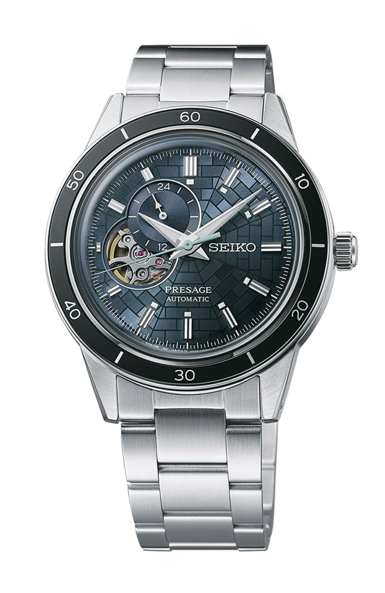 至於Presage SEIKO創立140週年銀座紀念錶款-SSA445J1的靈感取自Style 60’s系列,尤其SEIKO是以1964年針對日本首度舉辦國際體育賽事所特別研發的”Crown Chronograph”為基礎,加入本次獨有金春色秒針及面盤上的石板路花紋,並以復古箱型鏡面和立體時標引人懷想銀座的悠久發展歷程。這款錶最具特色的部分出現在面盤9點鐘位置,SEIKO採用開芯設計,讓佩戴者可以直接窺見機械機芯的規律作動,感受機械錶有別於石英錶的工藝魅力。