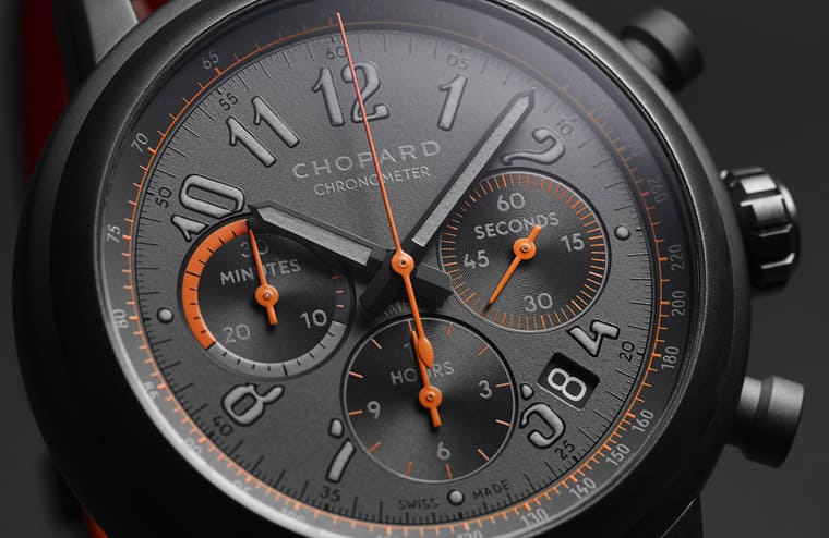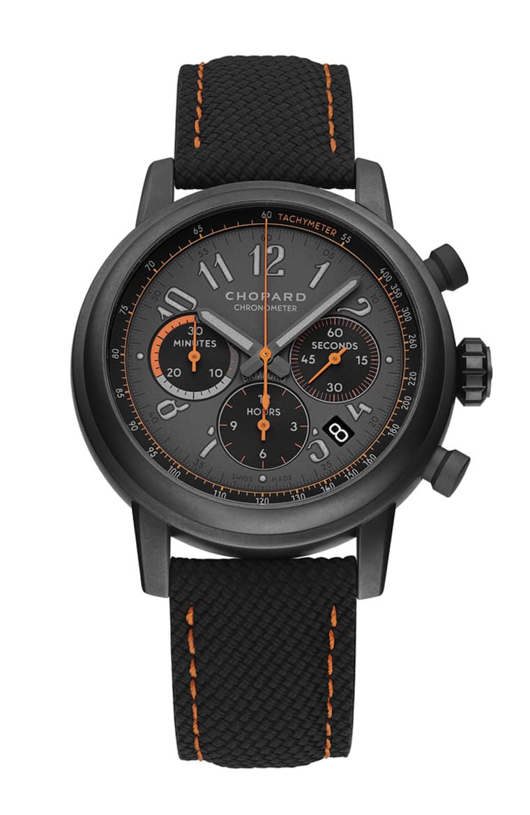 Mille Miglia Bamford特別版採用DLC不鏽鋼打造42mm錶殼,如此可以呈現出古董車身上常見的深灰色零件效果。錶冠頂部鐫刻有致敬古董車方向盤的輪廓,另外兩枚計時按把的造型也可明顯看出與汽車的活塞零件呼應。這款手錶搭配複合材質錶帶,包括表面是帶有織物效果的黑色橡膠、襯裡則為橘色小牛皮,同時黑色橡膠錶帶兩側又有橘色的縫線,散發出突顯古董車性能的活力感。