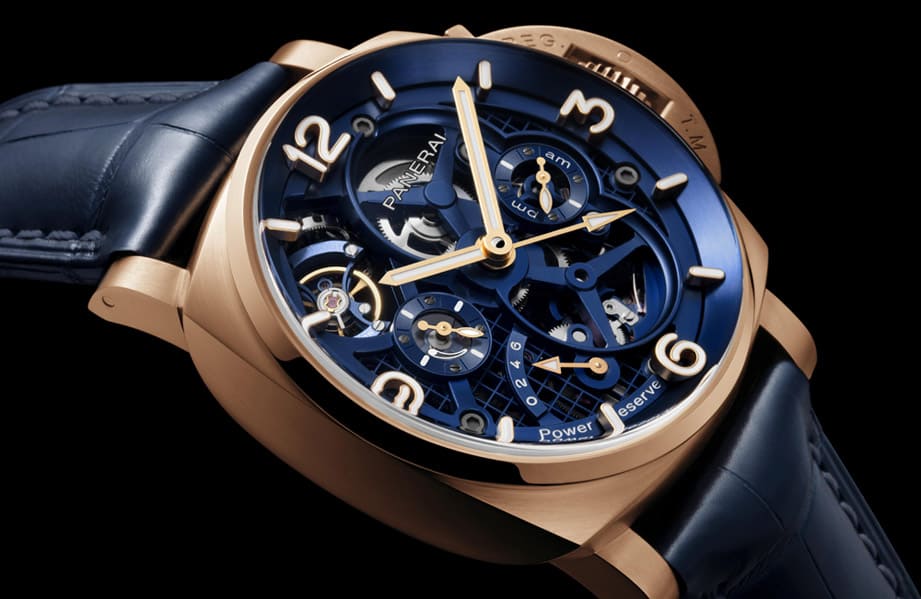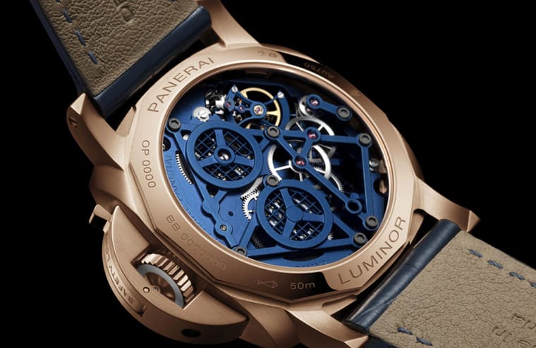 PAM01060有別於先前Luminor Tourbillon的地方還包括機芯機板、橋板等零件均被鍍上藍色,縱使機芯機種並沒有變,但是耳目一新的上色效果讓它看起來第一眼印象更強烈。沛納海的陀飛輪和別家的設計不太一樣,例如它的框架是與擺輪軸形成直角的軸心上旋轉,且陀飛輪裝置自轉時間縮短為30秒一圈,品牌透過增加自轉圈數和垂直運轉的方式,一方面呈現出更富視覺魅力的觀賞笑過,更重要的是還能進一步降低地心引力對機芯運作產生的影響,無形中有助於提升手錶的走時精準度。
