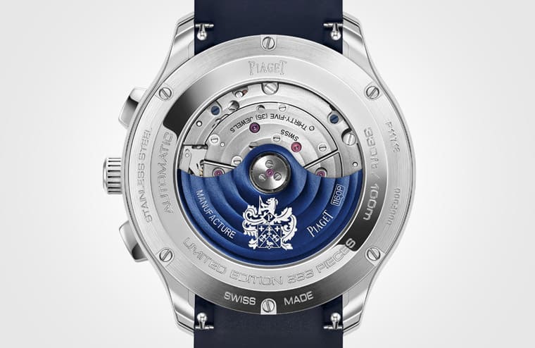 Polo計時碼錶搭載伯爵當初為了系列改款新開發的1160P機芯,與品牌同性質的880P機芯相較,1160P的25.58mm直徑較小、零件262枚也較少,但是機芯厚度5.72mm反而比880P略厚一些,其他重點規格兩者相去不遠,例如同樣有50小時動力儲存、震頻28,800vph,計時組件也都採用垂直離合與導柱輪的組合,以計時機芯來說,1160P的厚度算是相對纖薄,不過錶殼的整體厚度有11.2mm就跟伯爵其他超薄錶有明顯區隔了。之所以不特別將錶殼做薄或許跟系列的休閒運動風格定位有關,Polo計時碼錶和三針款的防水性能都達到100米,不過伯爵在錶背的設定上反而沒有太堅持純運動個性而採用透明底蓋,這讓手錶既能維持運動機能性,也滿足錶主想觀賞機芯細節的願望。新款Polo計時碼錶雖然機芯不變,不過品牌特別把自動盤鍍成了藍色用來呼應藍白熊貓面的特徵,比起舊款深灰色的自動盤,鍍成藍色的視覺效果當然更迷人。