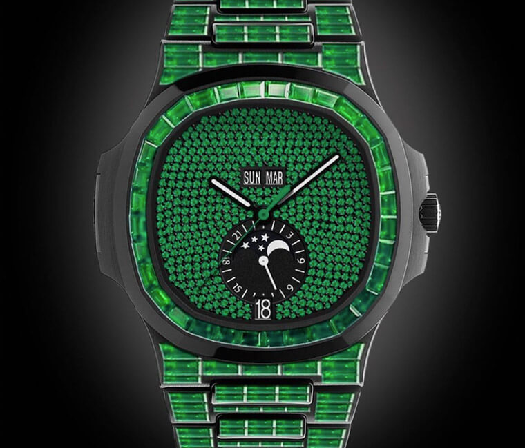 加拿大饒舌巨星Drake去年發表了他的最新單曲《Life Is Good》以及MV,這項消息經由他個人Instagram的放送下很快受到全球嘻哈樂迷的矚目,然而在這貼文隔日,Drake在Instagram Po出這只錶是百達翡麗的金鷹年曆錶5726, 由 Abloh 設計然後由改裝專家 MAD Paris 賦予生命。這支錶鑲滿了綠色的寶石同時錶殼也變成了黑色,連12點方向品牌的Logo都直接被寶石蓋過,震驚錶迷。