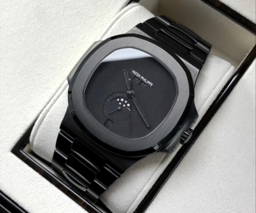這是另一款同樣帶有月相顯示的定制百達翡麗 Nautilus 5726 年曆錶,Virgil Abloh自己想要素淨的黑所以整支錶以DLC 鍍黑,在 DLC鍍黑 之前,手錶必須一塊一塊地完全拆解相當繁雜,面盤刻意以一對小引號將PATEK PHILIPPE標誌括起來,是他獨有的一種小幽默,整個訂製需要兩個月的過程,最後留白的只有Logo文字和月相上的星星,反倒是鮮明而簡約,很有他的味道。