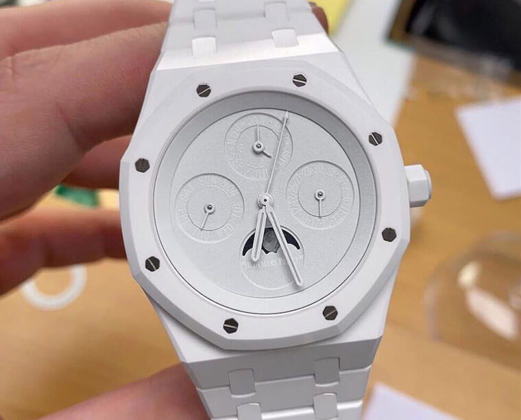 除了百達翡麗,Virgil Abloh早期曾委託客製一款白色陶瓷的AP皇家橡樹萬年曆手錶,這款AP和這只5711其實也有點異曲同工的味道,雖然皇家橡樹那款的功能性複雜許多,但是MAD Paris一樣把指示萬年曆資訊的小錶盤全部塗白,所以包含日期、星期、月份都看不見,原本熟悉的面盤只剩下月相並沒有被「白化」,相當不可思議。