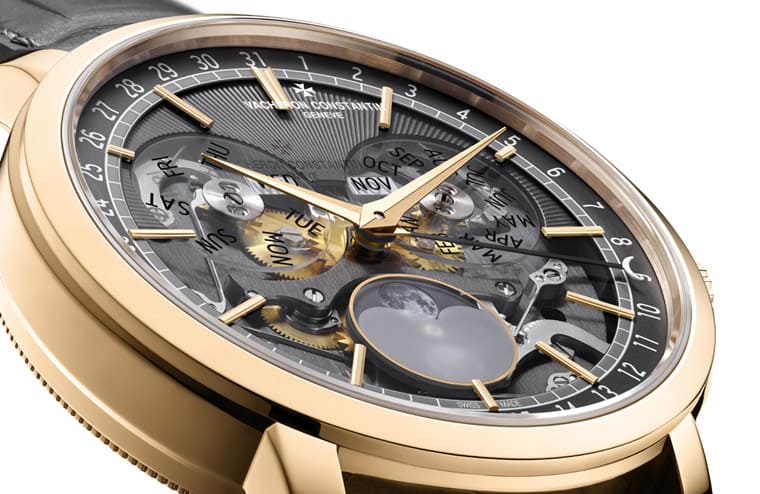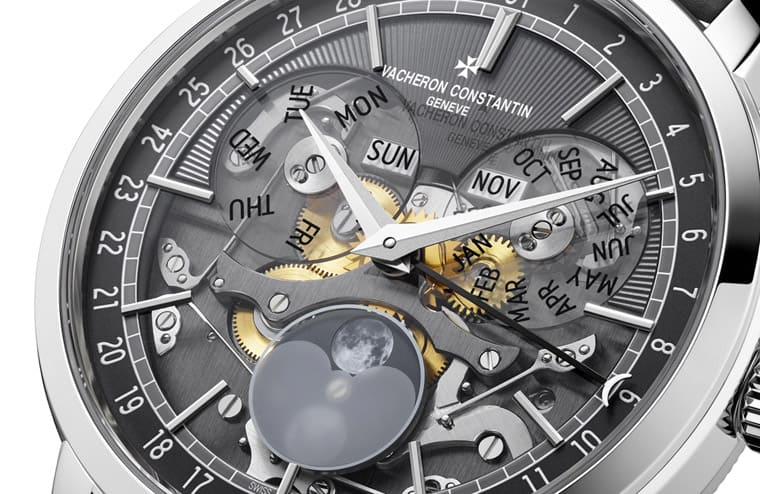 視線移致面盤,由於江詩丹頓採用藍寶石水晶面盤的關係,所以佩戴者可以直接欣賞到手錶搭載2460 QCL/2機芯的正面樣貌,而這也是其之所以讓人想起Traditionnelle Twin Beat的重要設計。機芯正面的夾板與橋板採用NAC電鍍呈現簡樸的煤灰色調,同時在面盤上半部還出現品牌精心安排的機刻雕花Guilloché圖案。大致而言Traditionnelle全日曆手錶面盤可分成三大結構,第一部分為暗灰色的刻度環、第二部分為藍 寶石水晶面盤,第三部分則是另兩枚藍寶石水晶圓盤,用作顯示星期和月份。而在6點方向也還有迷人的月相顯示,其月亮圖案不僅陰影層次鮮明看起來栩栩如生,包括月相遮板也採用半透明藍寶石水晶製成,使得兩枚交替出現的月亮其中有一枚帶點若隱若現的效果。由以上這些設計,譜成手錶兼具日期、星期與月相等三曆功能,並且還附帶月相顯示,一展豐富的顯時資訊。