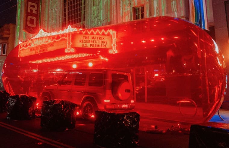 說到藥丸,前幾天在美國舊金山舉辦的首映會上,電影公司與片中的名車贊助品牌MERCEDES-BENZ就合力打造一件長12公尺、寬4公尺、高3.5公尺的紅色藥丸裝置藝術,其中展示一部Mercedes-AMG G 63——讓人提前感受到電影中尼歐和崔妮蒂與賓士的G-Class會有一段難忘的出生入死場景。