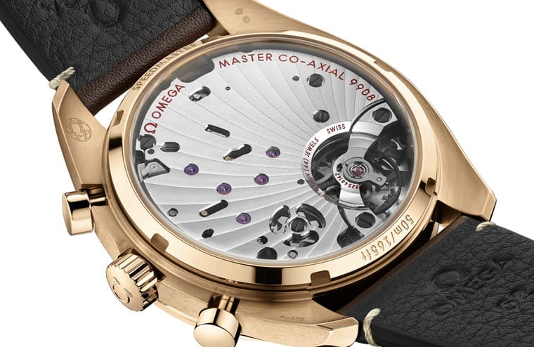 歐米茄特別為了這款計時臻品打造出9908大師天文台認證機芯,這枚機芯採用3/4夾板設計,位於機芯一隅的擒縱系統則有橫跨式橋板牢牢固定,有意思的是,過往品牌在機芯板件上施加藤蔓花紋般的日內瓦波紋時往往會以機芯中央軸心為放射中心,但是9908機芯卻開啟品牌先例以擒縱系統為中心發散日內瓦波紋,形成令人耳目一新的視覺效果。