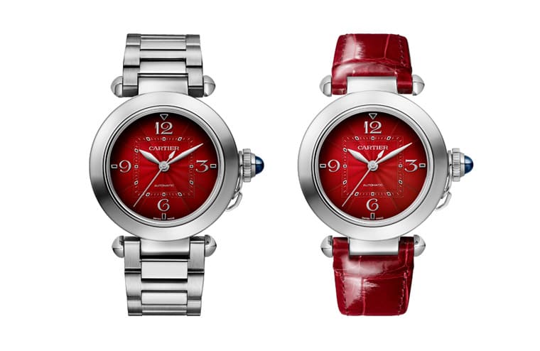 首先看到的是錶徑35mm的Pasha手錶,其採用不鏽鋼材質,並搭載1847 MC自動機芯。手錶搭配漸層紅色雕紋面盤並襯上鍍銀阿拉伯數字,使得Pasha手錶散發出濃厚的新春氣息,而這款亦延續品牌近年大力推行的錶帶快拆系統(QuickSwitch)及快拆鍊節(SmartLink)設計,錶主可以自由在亮面紅色鱷魚皮錶帶及不鏽鋼鍊帶兩種錶帶間,自由轉換,呈現多樣化的佩戴風格。