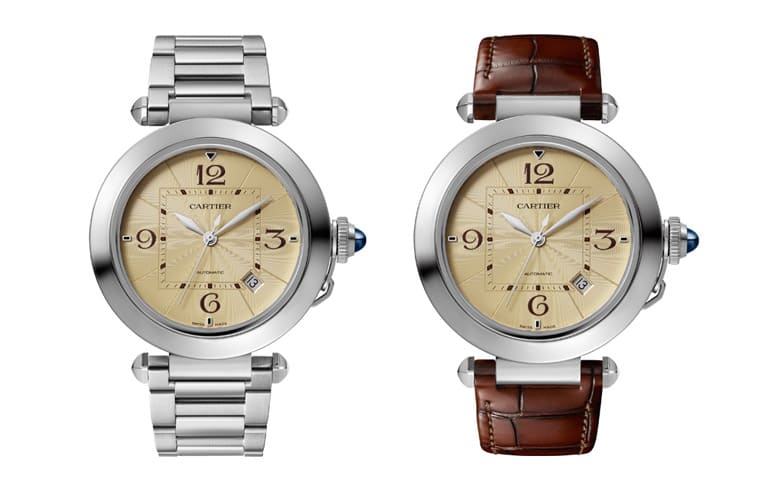 另一款Pasha手錶的錶徑為41mm,而且也搭載了自動機芯,功能性則從大三針再添加了日期豐富顯時資訊。錶款的面盤採用香檳色雕紋和深棕色阿拉伯數字,搭配棕色鱷魚皮錶帶,呈現出內斂沉穩的個性。