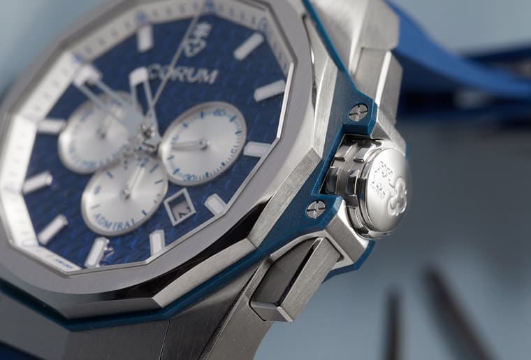 新款海軍上將45限量計時碼錶採用輕量、高硬度、耐腐蝕,親膚性佳的五級鈦金屬錶殼,並分別擁有綠色與藍色兩種款式,除了面盤,包括錶殼的中間夾層或橡膠錶帶等以及海事旗時標等也都可見相同顏色。