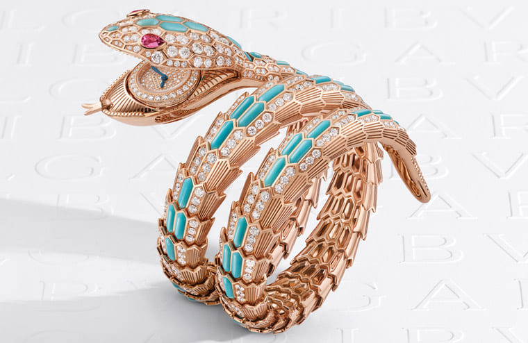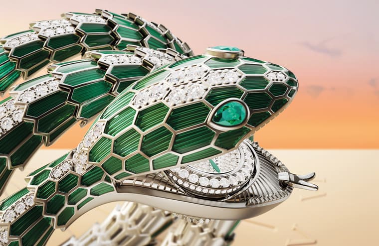 Serpenti Misteriosi神祕錶分別有鑲鑽款與漆藝/鑲鑽款,後者會將半透明亮漆經反覆的手工塗繪,使漆體在乾燥過程中形成結晶,而金屬蛇鱗則會飾以手繪條紋,讓蛇身呈現更栩栩如生的效果。蛇身化作雙圈黃金錶帶,環繞腕間;寶格麗採用紅碧璽、祖母綠和鑽石蛇眼,利用寶石的色澤與光澤,賦予靈蛇造型炯炯有神的視線。