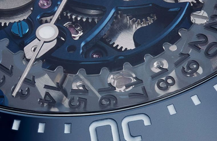 原本Deepsea的黑色陶瓷錶圈也同步換成深藍色調,與機芯零件、面盤外緣刻度環的藍色深淺有別,強化手錶藍色系的視覺層次效果。Source:Artisans de Genève