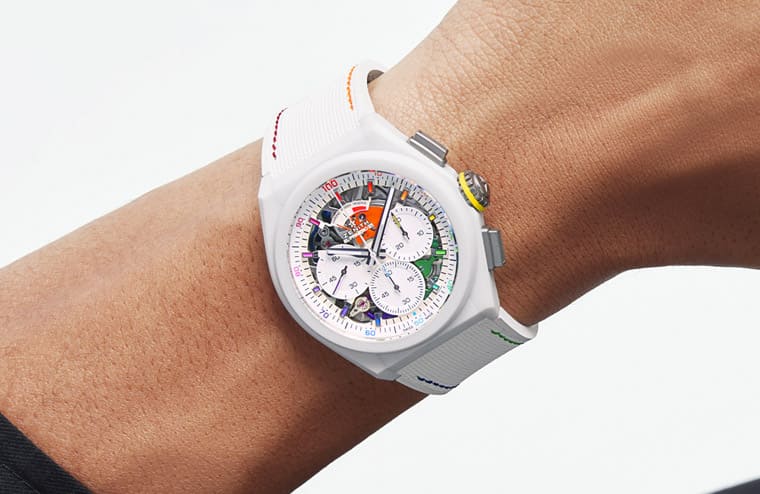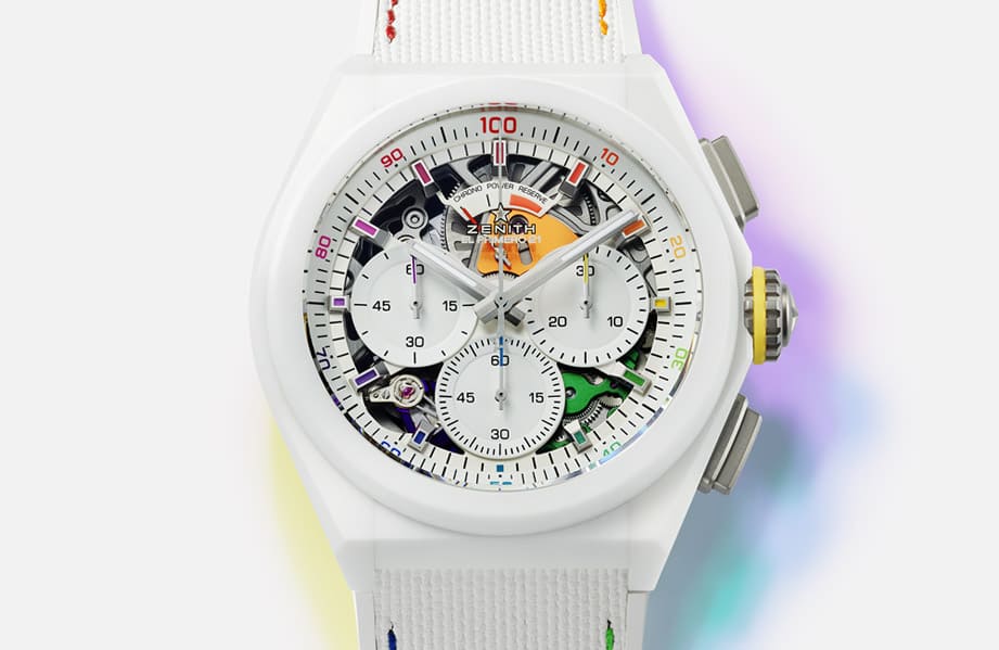 ZENITH真力時2022年發表新作DEFY 21 Chroma,手錶以白色陶瓷殼為主,搭配白色橡膠錶帶,乍看一派簡約素雅,但在細看手錶面盤會發現品牌巧妙融入繽紛彩虹配色,以鮮豔色彩吸引人們的欣賞目光。