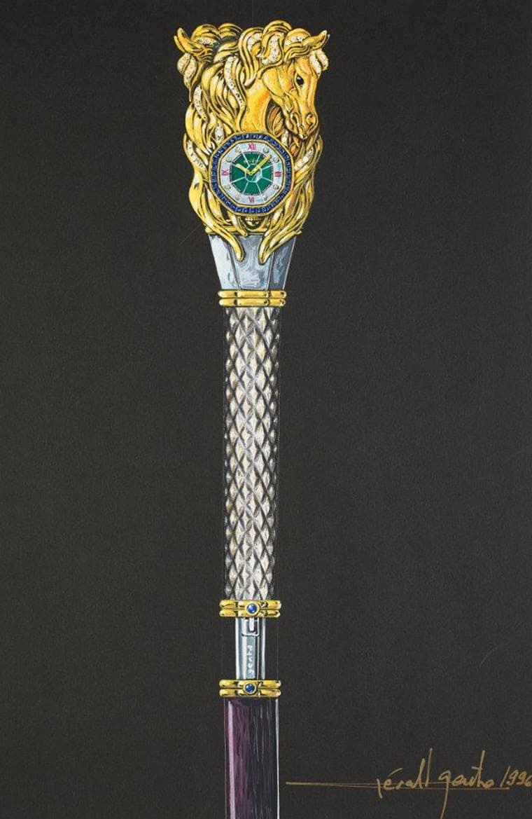 曾找上Gérald Genta設計手錶的私人客戶例如摩洛哥國王、阿曼蘇丹和文萊蘇丹、西班牙國王、沙烏地阿拉伯國王,以及身家驚人的商人、運動員和藝人等,圖上這件作為為Genta替一位未公開身份的國家元首設計的馬形劍杖特殊時計,上頭鑲嵌鑽石以及細緻的馬首金雕,奢華風格現在看起來依舊很有特色。