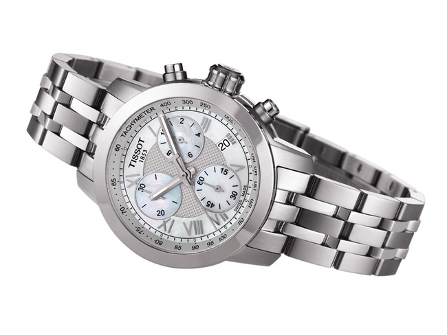 天梭娉馳200自動計時碼錶採用古典優雅的圓形316L精鋼錶殼,拋光錶圈設計簡約,把人們的視線集中到錶盤上。錶盤以珍珠白或寶石藍的娉婷色調暈染,女性的柔美在泛著七彩微光的盤面上凸顯出來。錶盤的中央區域設計有「巴黎飾釘」圖案,酷似浮雕,微微凸起,增加錶盤立體感和質感的同時,也為手錶更添一抹花都風情,散發著柔美性感的女性魅力。