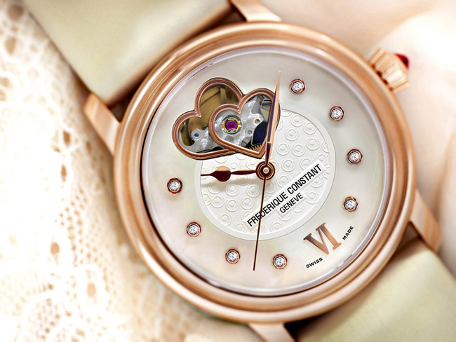 女裝雙心跳-世界心臟組織聯會紀念自動手錶(Ladies Automatic – World Heart Federation,直徑 34mm,銀色錶盤上鑲嵌了 8顆 VS 鑽石刻度,恆久美鑽與玫瑰金的錶殼互相輝映。錶盤中央刻有世界心臟聯盟標誌的 guilloche,外圈則以優雅的珍珠母貝錶盤作裝飾,盡顯高貴氣質;最後搭配米白色絹帶,簡潔優雅。康斯登更捐出一百枚予聯盟的全球成員組織,支持預防孩子及婦女患上心血管疾病,為女裝雙心跳-世界心臟聯盟紀念自動手錶平添意義。
