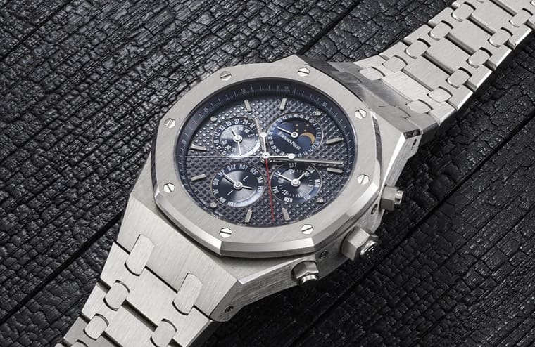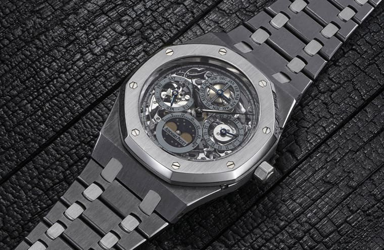 另外還有兩款大複雜功能的皇家橡樹手錶也很值得關注,一款是融匯三問、萬年曆和追針計時的25865ST,另一款25990BC同樣也集結三問、萬年曆和追針等複雜功能,不過它的白金錶殼和鍊帶鑲滿鑽石,兩只錶的預估價高標都達到50萬瑞郎。