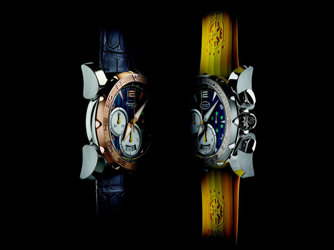 帕瑪強尼 Chronograph的這款男士手錶,錶背上刻有CBF的標誌圖案,整枚手錶都充滿著官方巴西足球聯盟的色彩:金色、藍色及綠色。這款手錶直徑為45毫米,有兩種款式可供選擇:鈦金屬錶殼配玫瑰金錶圈或鈦金屬錶殼配白金錶圈的雙色款。這兩個款式的錶盤由標誌性的深藍色和“日內瓦波紋”格狀紋裝飾。小秒時標被綠色星星取代,代表巴西所獲的五次世界盃冠軍。而綠色數字和黃金指針令小時及分鐘計時盤大為增色。錶盤周圍的測速計也採用了巴西隊經典的金黃色。