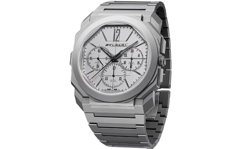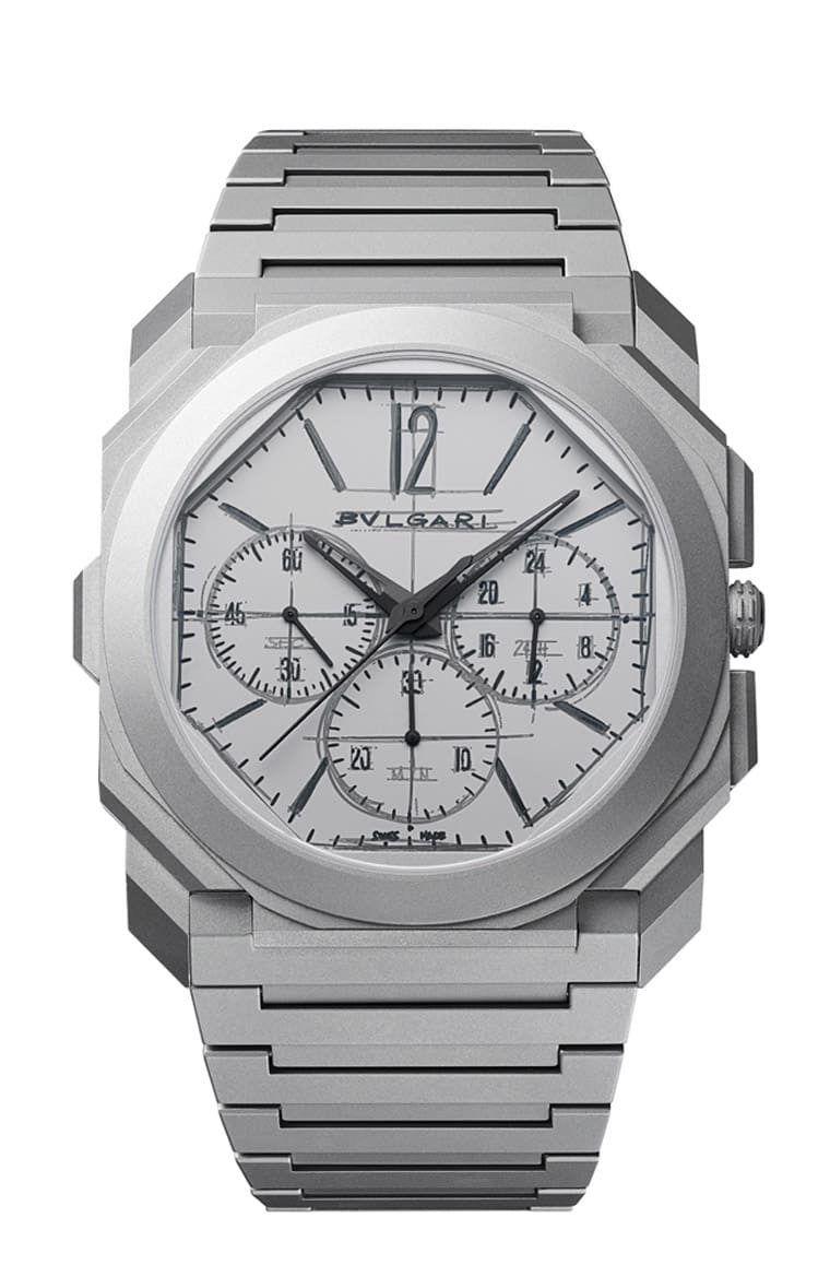 ▲錶款依舊採用噴砂處理的鈦金屬錶殼與鍊帶,低調卻深刻地展現Octo系列招牌的多角切面造型美學。