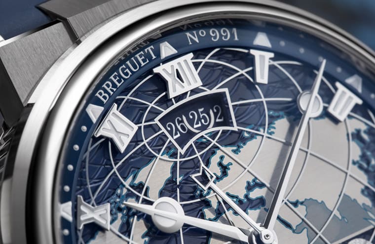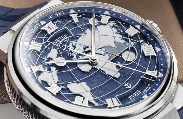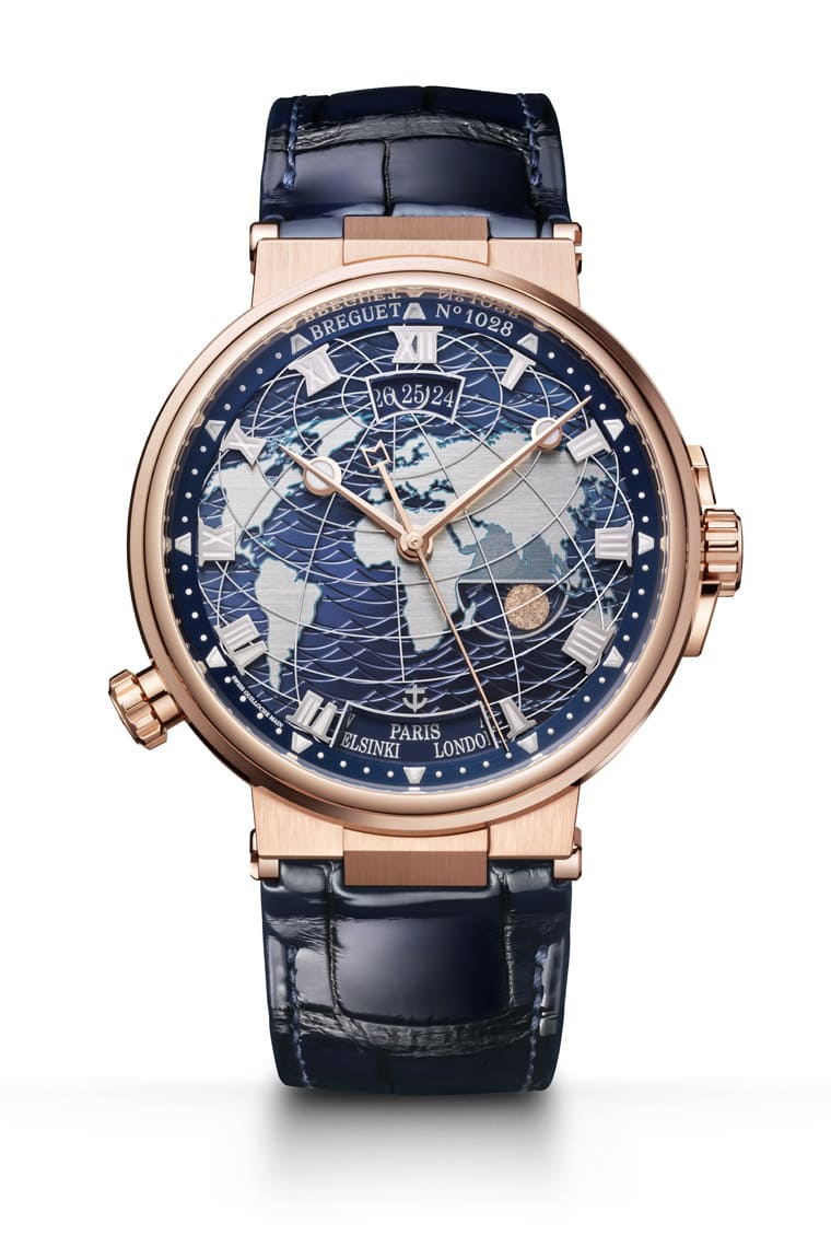 新款分別推出白金與玫瑰金錶殼版本,其沿襲現役Marine系列的外觀特徵,不過系列原本帶有高識別性的波浪狀機刻紋路則是隨著新挹注的兩地時間功能而有相應的新變化。寶璣運用不同材質製作面盤,並疊加不同的圓盤,如第一層為金質底板,手工機刻雕花的波浪紋路圍繞在各大洲的圖案旁邊。陸地圖案經水平緞面打磨,並以精緻的金屬感藍綠色勾勒出海岸線,品牌還額外運用藍寶石水晶圓盤再飾以經緯線,讓面盤彷彿一個微型的地球儀般生動。